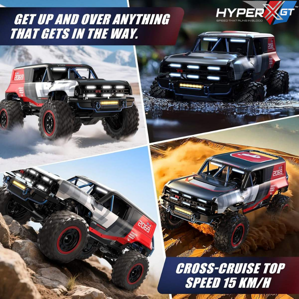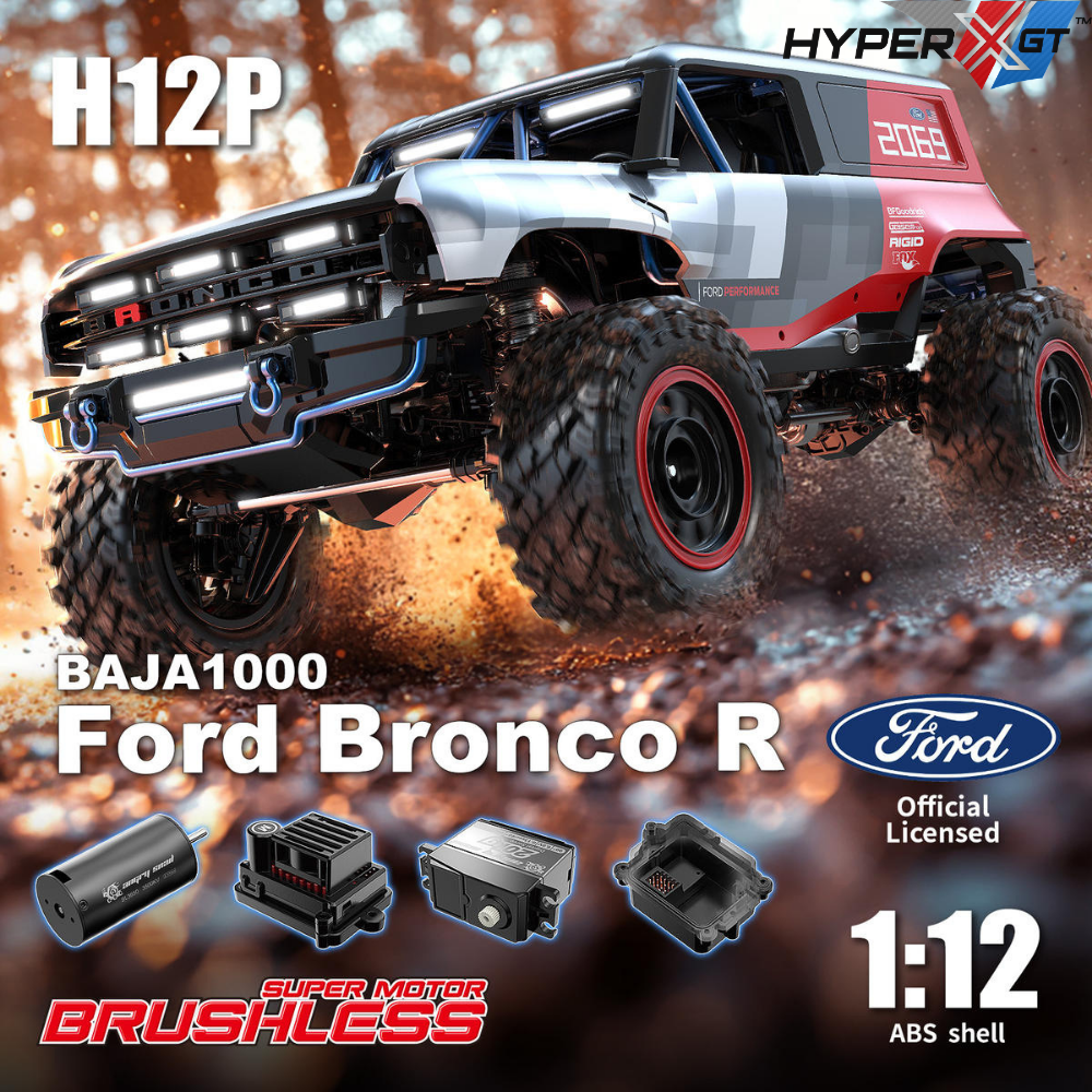 Professional 1:12 Scale MJX H12P Hyper Go 4WD Brushless RC Crawler Truck with 2.4GHz remote control system and powerful off-road performance. Official Ford Bronco Baja 1000 R licensed model, built for high-speed driving, climbing, and extreme off-road adventures. 🚗