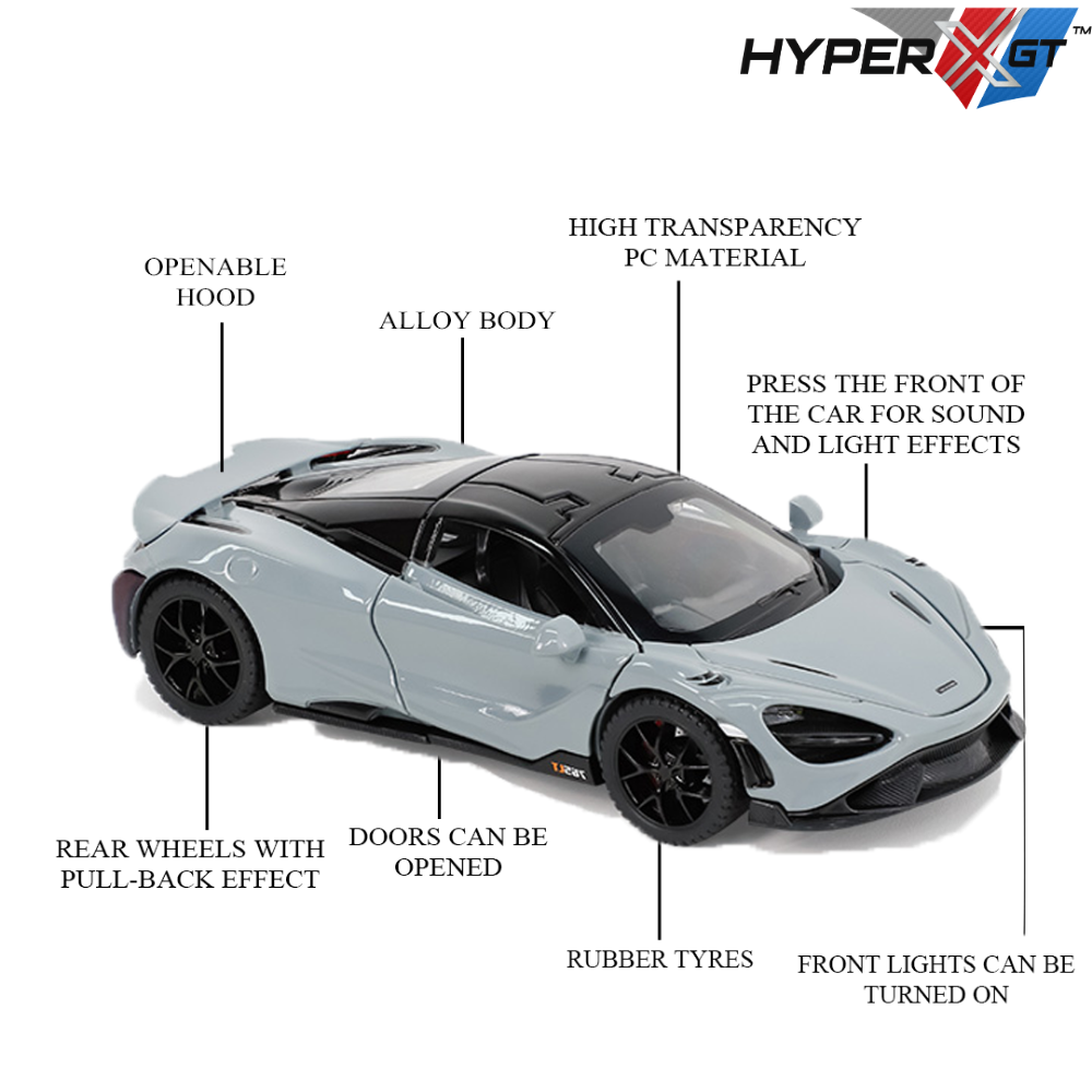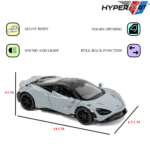 The model delivers the thrill of a supercar in miniature form. Crafted with precision from high-quality alloy and plastic materials, this model replicates the aerodynamic beauty and performance essence of the real McLaren. It features openable doors, a smooth pull-back mechanism, and a sleek black finish for an authentic, collectible look. Designed for both kids and collectors, it offers a premium play and display experience with lasting durability and realistic styling.